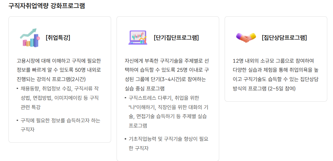 단기 프로그램 및 특강: 구직 기술을 보완할 수 있는 단기 특강이 정기적으로 열리며, 구직자 개개인의 상황에 맞춘 맞춤형 컨설팅도 가능합니다.