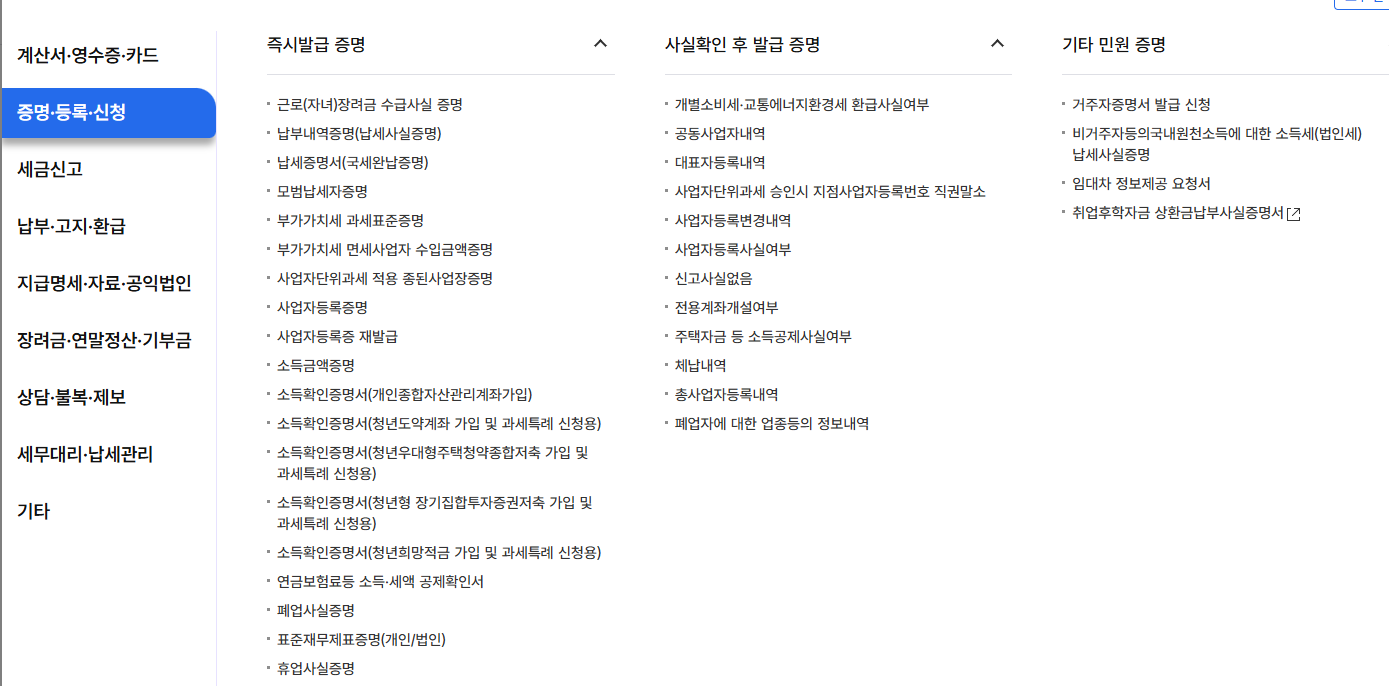 각종 증명서 발급도 가능합니다. 소득금액증명원, 사업자등록증명, 납세증명서 같은 서류를 발급받아야 할 일이 생길 때, 국세청 홈택스를 통해 간단히 처리할 수 있습니다.